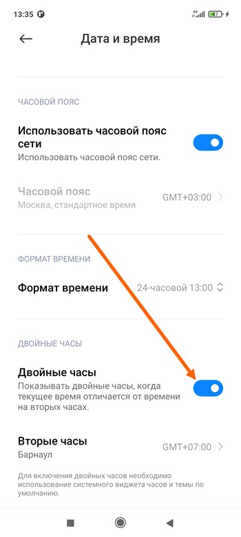 - Активируем пункт «Двойные часы».
