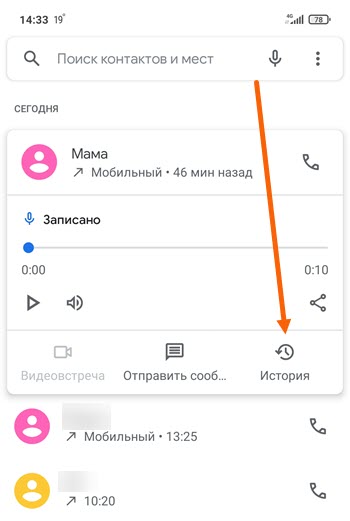 3. Находим нужный контакт с кем был записан разговор, он помечен синим значком микрофон, жмём на него.