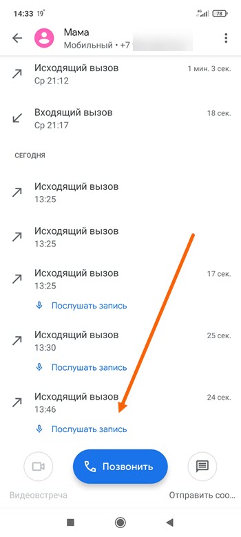 5. Находим нужную запись и жмём на кнопку «Прослушать».
