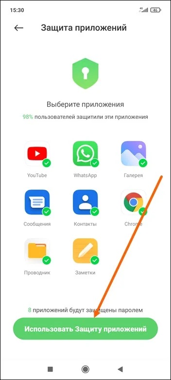 7. Остаётся выделить галочкой нужные приложения и нажать на кнопку «Использовать защиту».