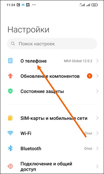 2. В самом верху настроек, располагается пункт «О телефоне», переходим в него.