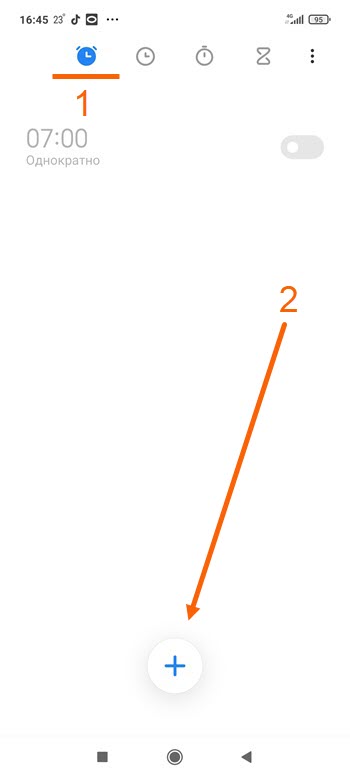 2. В самом верху открывшегося окна, нажимаем на иконку «Будильник», после на «Плюс» в низу экрана.