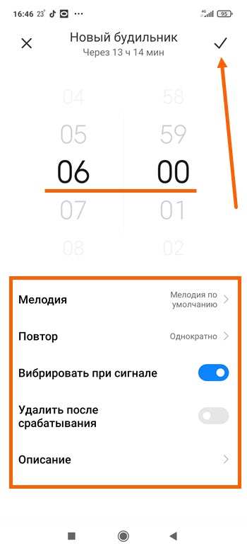 3. Производим настройки(если необходимо), указываем время срабатывания, после жмём на галочку для сохранения.
