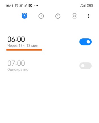 4. Теперь мы видим что будильник включен, а так-же указанно через сколько он заиграет.