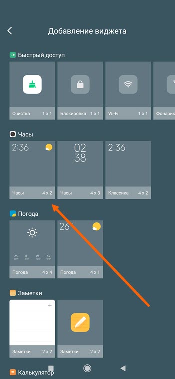 3. Среди виджетов находим часы и выбираем нужный формат, я для примера выбрал с погодой.