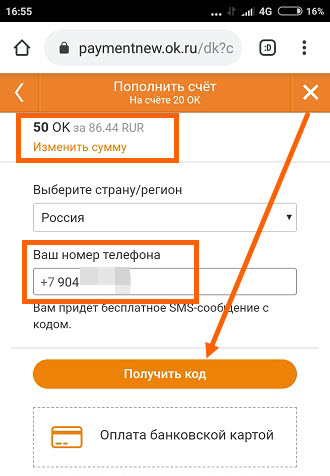 Внимание — этот способ наверное самый простой, но не самый выгодный, на момент написания статьи, за 50 ОК с мобильного счёта спишут 86.44 рублей.