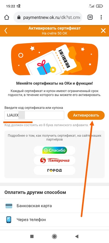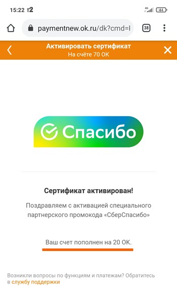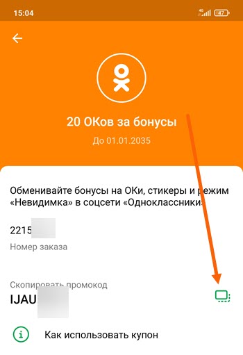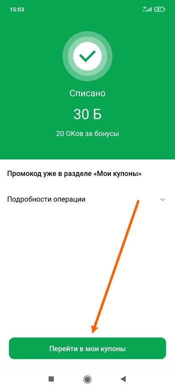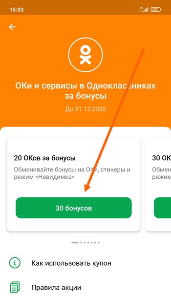 Принцип тот-же, в мобильном приложении Сбербанк Онлайн мы приобретём специальный купон за бонусы, после чего активируем его в Одноклассниках.