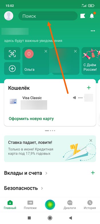 1. Открываем Сбербанк Онлайн, после жмём на поле «Поиск».