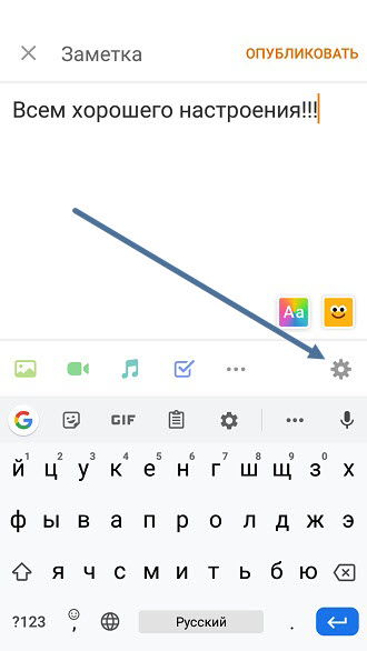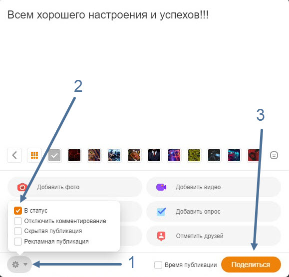 3. Когда оформление закончено, жмём на кнопку «Шестерёнка» в левом нижнем углу окна, во вновь открывшемся окне, выделяем галочкой пункт «В статус», после жмём кнопку «Поделиться».