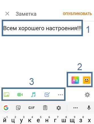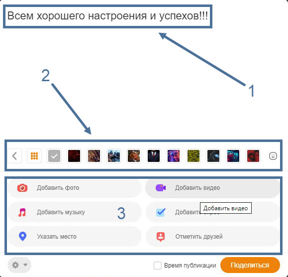 Помимо текста, в статус можно добавить: фото, музыку, видео, опрос, указать место на карте и отметить друзей, а также украсить его красивым фоном. Делается это следующим образом.