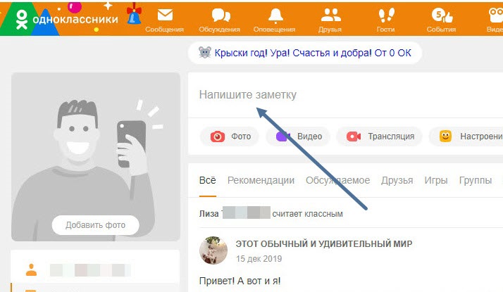 1. Заходим на свою страницу, далее кликаем по окну «Напишите заметку» в верхней части сайта.