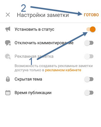 4. Включаем тумблер напротив пункта «Установить в статус» и нажать кнопку «Готово».