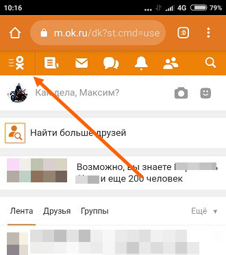 1. Открываем мобильную версию ОК, далее жмём на кнопку «Меню», в левом верхнем углу.