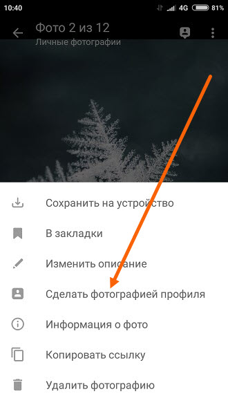 6. В открывшемся окне, выбираем нужное значение «Сделать фотографией профиля».