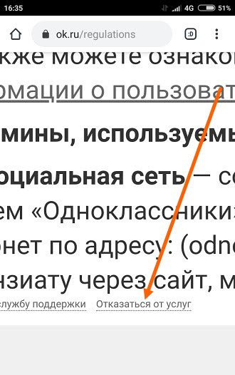 11. В низу страницы соглашения, находится чуть заметная ссылка «Отказаться от услуг», увеличиваем страницу и жмём на неё.