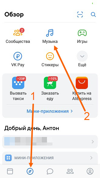 Для того чтобы открыть музыку, нужно нажать на кнопку «Обзор» в виде компаса, далее перейти в радел «Музыка».