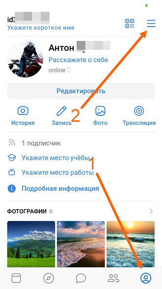Для того чтобы открыть меню, нужно нажать на кнопку профиль, в открывшемся профиле нажать на кнопку «Меню», расположенную в правом верхнем углу.