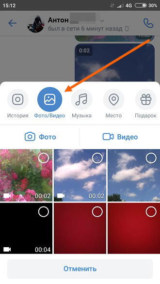 Вот так видеоролик добавляется из галереи в сообщение.