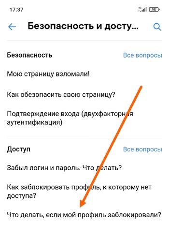 Я для примера выберу «Что делать если мой профиль заблокировали», вы выбирайте исходя из своей проблемы.