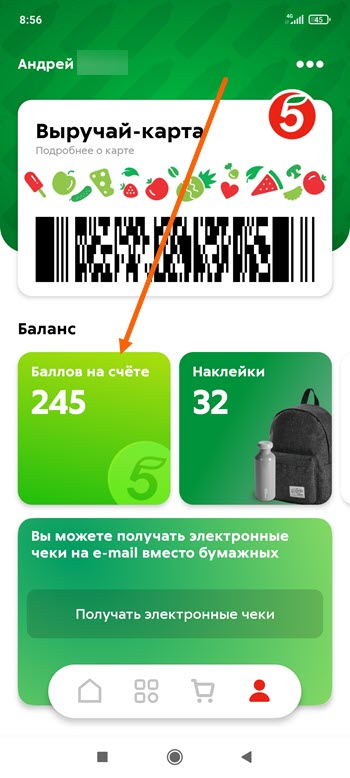 1. Открываем приложение Пятёрочка, и проверяем количество накопленных балов.