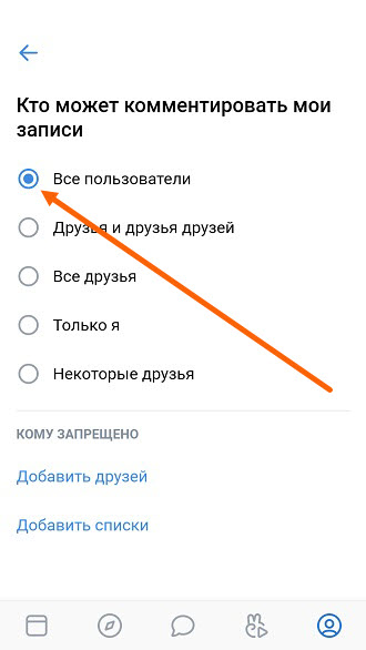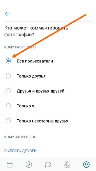 7. Выбираем «Все пользователи» либо «Только друзья».