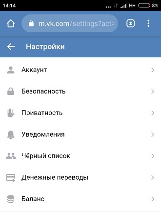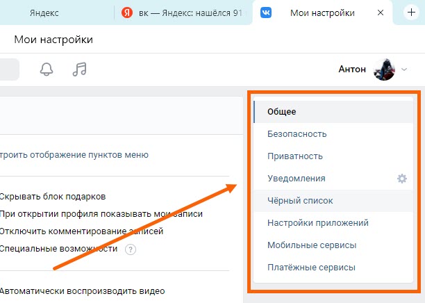 2. Перед нами автоматически открылась вкладка «Общие», в окне справа, мы также можем выбрать настройки: безопасности, приватности, уведомлений, чёрного списка, приложений, мобильных сервисов и платежей.