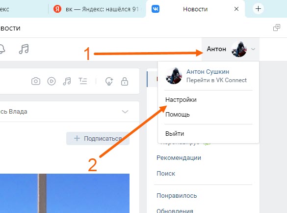 1. Открываем свою страницу, далее жмём на кнопку с именем и аватаркой (в верхней части справа), в выпавшем окне, жмём на пункт «Настройки».