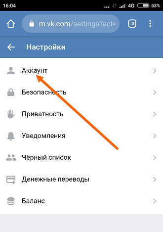 3. В настройках выбираем раздел «Аккаунт».