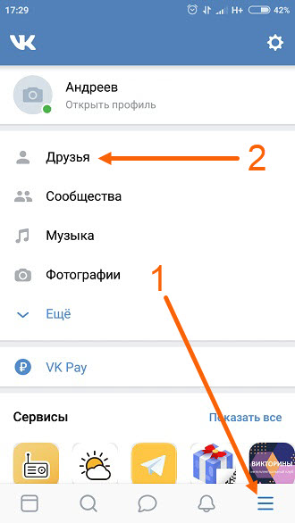 1. Запускаем приложение ВКонтакте на своём телефоне, далее переходим в меню, нажав на значок «Три горизонтальные линии», в открывшемся меню выбираем раздел «Друзья».