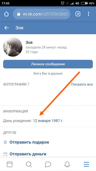 Заходим на страницу к другу, в строке «Информация» указан его день рождения.