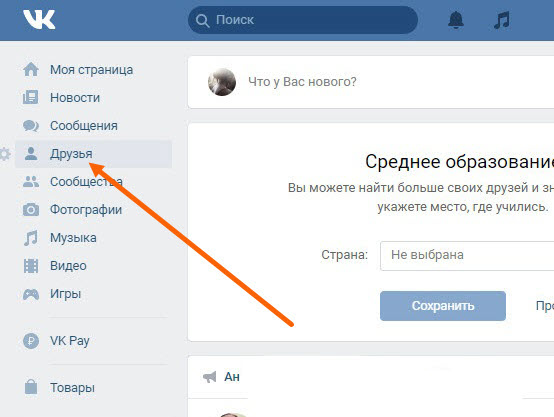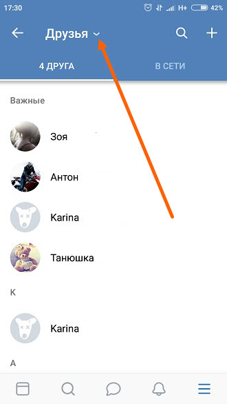 2. Здесь нам необходимо нажать на небольшую стрелочку, рядом с названием раздела «Друзья».