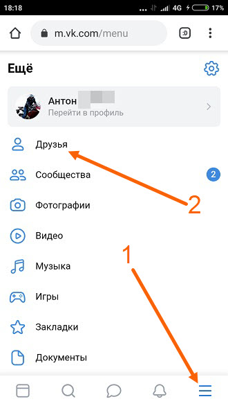 1. Жмём на кнопку «Меню», далее переходим в раздел «Друзья».