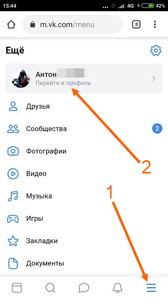 1. Заходим в меню, нажав на значок три горизонтальные полосы, далее жмём на серую ссылку под именем «Перейти в профиль».