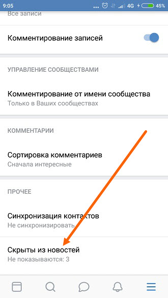 3. Прокручиваем настрой аккаунта в самый низ, там находится пункт «Скрыты из новостей», жмём на него.