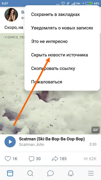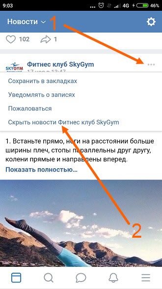 Находим в ленте новость друга или группы, далее жмём на кнопку «Три горизонтальные точки», в открывшемся окне, выбираем пункт «Скрыть новости.