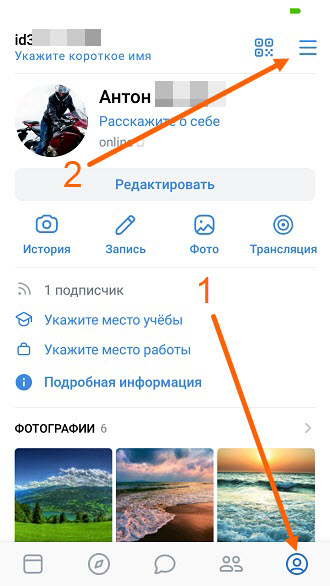 1. Открываем свой профиль нажав на кнопку в правом нижнем углу, далее жмём на кнопку «Меню».