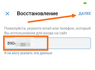 3. Пишем номер телефона, который использовали для входа на сайт, после жмём кнопку «Далее».