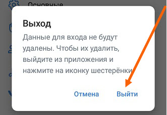 4. В открывшемся окне, сказано: «Данные для входа не будут удалены. Чтобы их удалить, выйдите из приложения и нажмите на иконку шестерёнки». Жмём «Выйти».