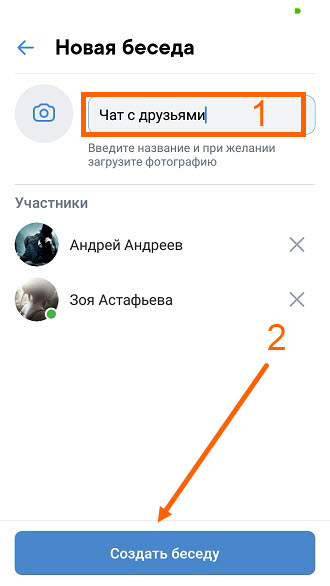 5. Даём название, после жмём на кнопку «Создать беседу», при необходимости, можно установить аватарку, нажав на значок фотоаппарат.