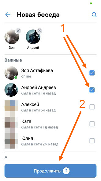 4. На открывшейся странице, выделяем галочкой пользователей которых нужно добавить в беседу, после жмём кнопку «Продолжить».