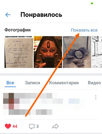 3. В самом верху находятся понравившиеся фотографии, жмём на ссылку «Показать все».