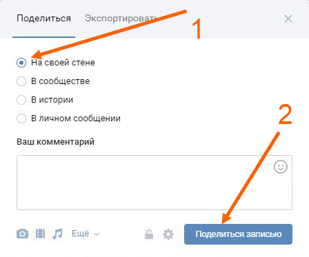 2. В открывшемся окне, выделяем пункт «На своей стене», после жмём кнопку «Поделится записью».