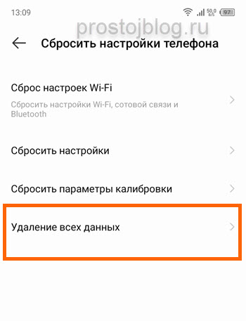 4. На вновь открывшейся странице, нас интересует последний пункт «Удаление всех данных».