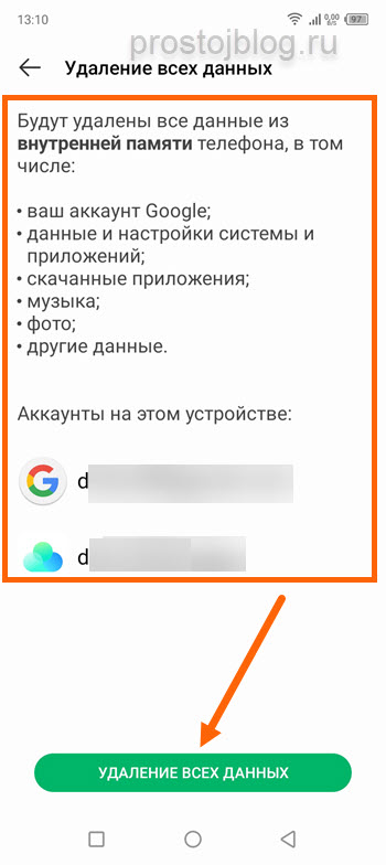 Внимание после сброса, из внутренней памяти удалятся все данные, такие как аккаунты, фото, музыка, видео и.т.д.