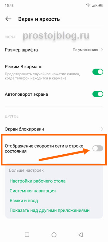 3. Находим пункт «Отображение скорости сети в строке состояние», активируем, либо наоборот деактивируем, тумблер напротив него.